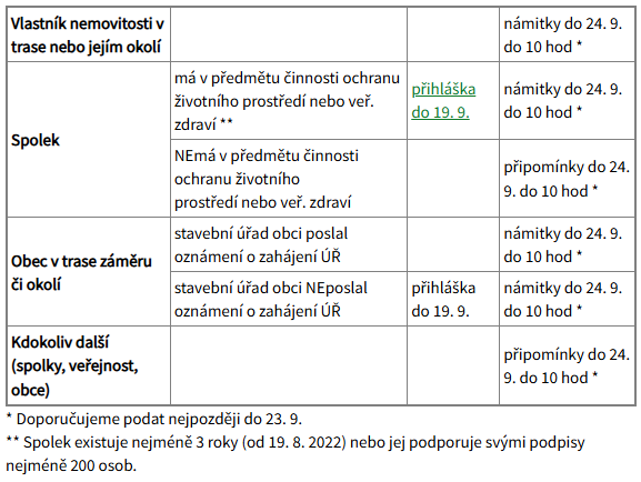 P.S. V tabulce jsou kromě námitek uvedeny i „připomínky“. Připomínky může podat úplně každý, ať má nemovitost v trase či okolí zamýšlené dálnice nebo ne, spolek s jakýmkoliv předmětem činnosti, jakákoliv obec nebo kdokoliv další. Pro připomínky můžete použít argumenty ze vzorů „námitek“. Adresujte a pošlete je stejně, jako námitky.
